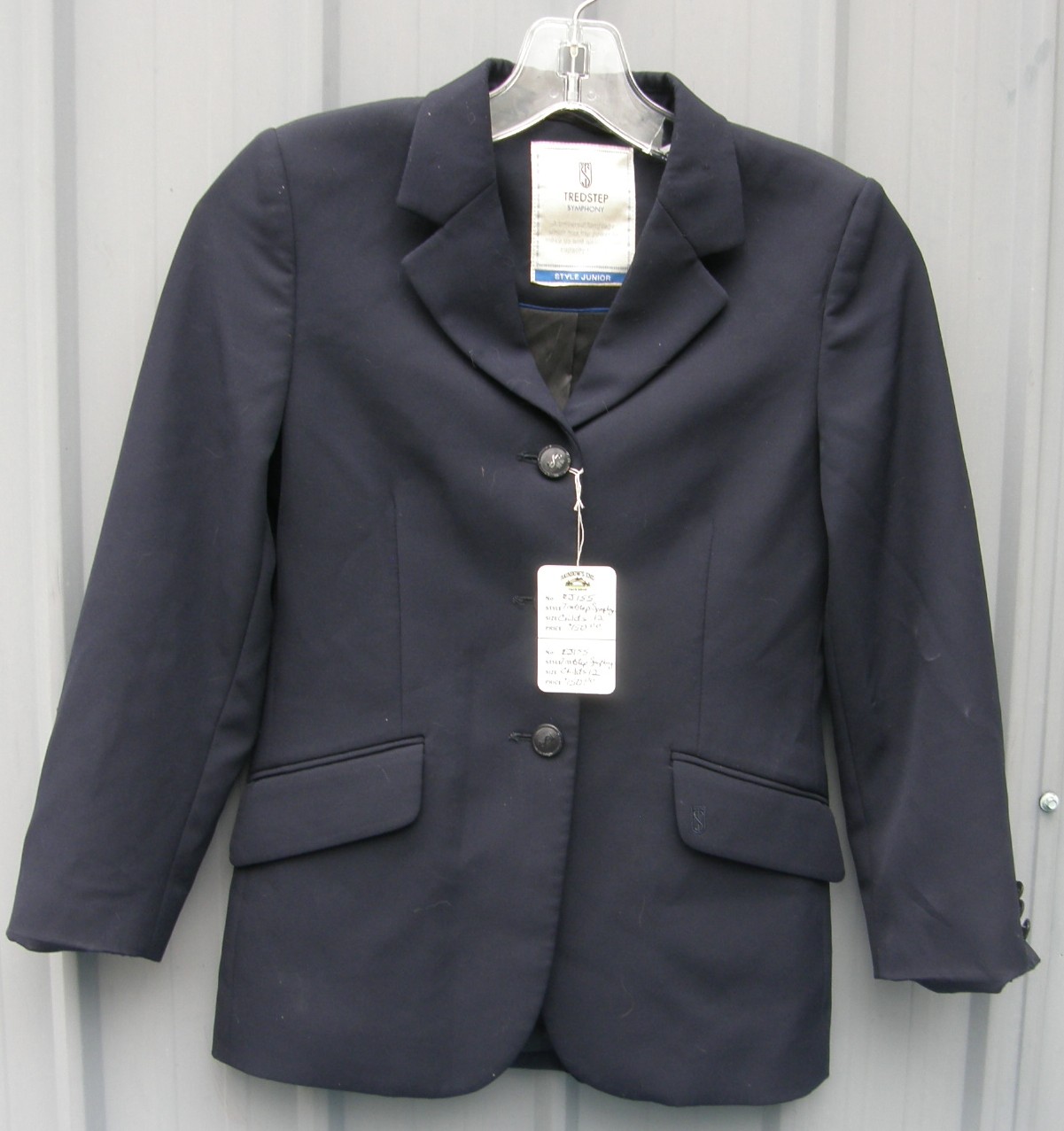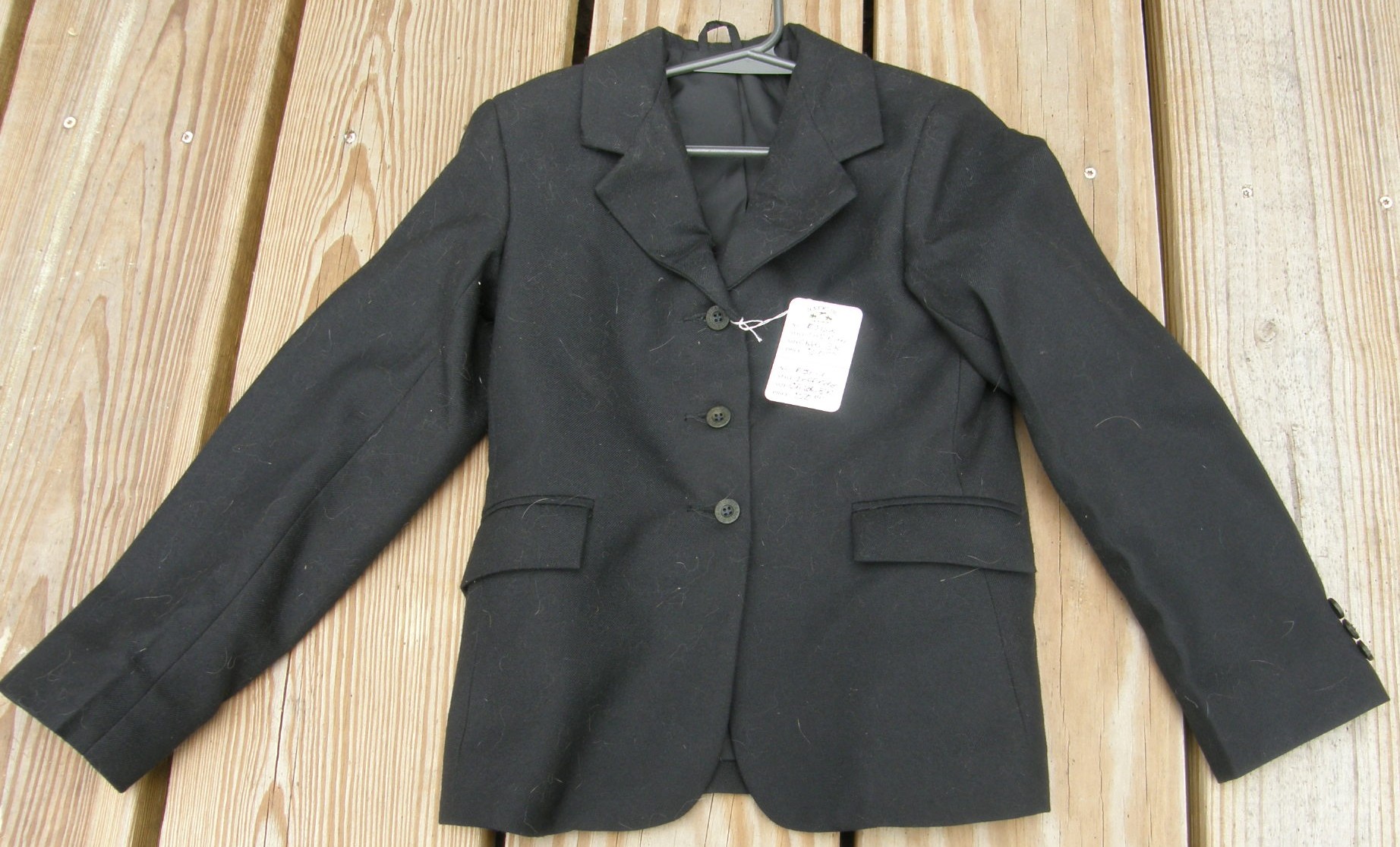 Easy care breathable fully lined English show jacket with "noiseless" twill fabric, 4 way stretch with 3 button front, 2 stitched shut front pockets, 3 buttons on sleeves, darted & fitted, & double vented back. Machine washable 91% poly/9% elastane. Tagged Childs 12, it flat measures approx 15" armpit to armpit across the front, 23" mid shoulder to bottom hem, & 13" sleeve inseam.