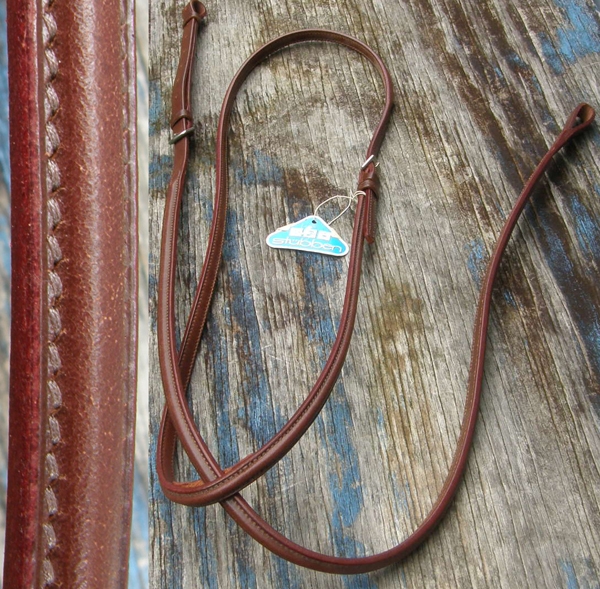 11/16" wide leather with round raised center, loop that attaches to caveson under chin, loop to attach to girth, & has 1/2" round raised neck strap. Tagged FS(Full Size Horse), it measures almost 50" as adjusted now on shortest hole out of 9 factory punched holes. Stamped Stubben. Color is almost a burgundy brown.