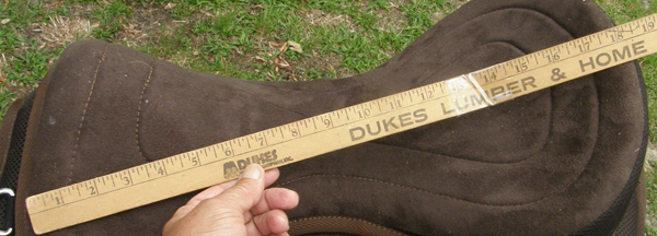 Treeless English saddle with removable padded suede seat, suede covered flaps, front & back leg bblocks, conway buckle adjustment on single in line holes on synthetic stirrup leathers, D rings front & back for attaching breastplate, saddlebags, crupper, etc, & has long double billets that attach at bottom of flaps for less bulk under the legs. Measures 17" as shown or 18" from where the button would be on a traditional English saddle to cantle. Fully lined with synthetic fleece, this can be used with a pad or without similar to a bareback pad. Lightweight & comfortable for both the horse & the rider. Comes with 4 1/2" wide fleece lined synthetic girth with elastic insert center, roller buckles, D ring for attaching training aid or breastplate & measures 23" from buckle to buckle or 29 1/2" overall. Owner used this only once or twice so in excellent hardly used condition. Comes with aluminum English style stirrups with 4" tread.