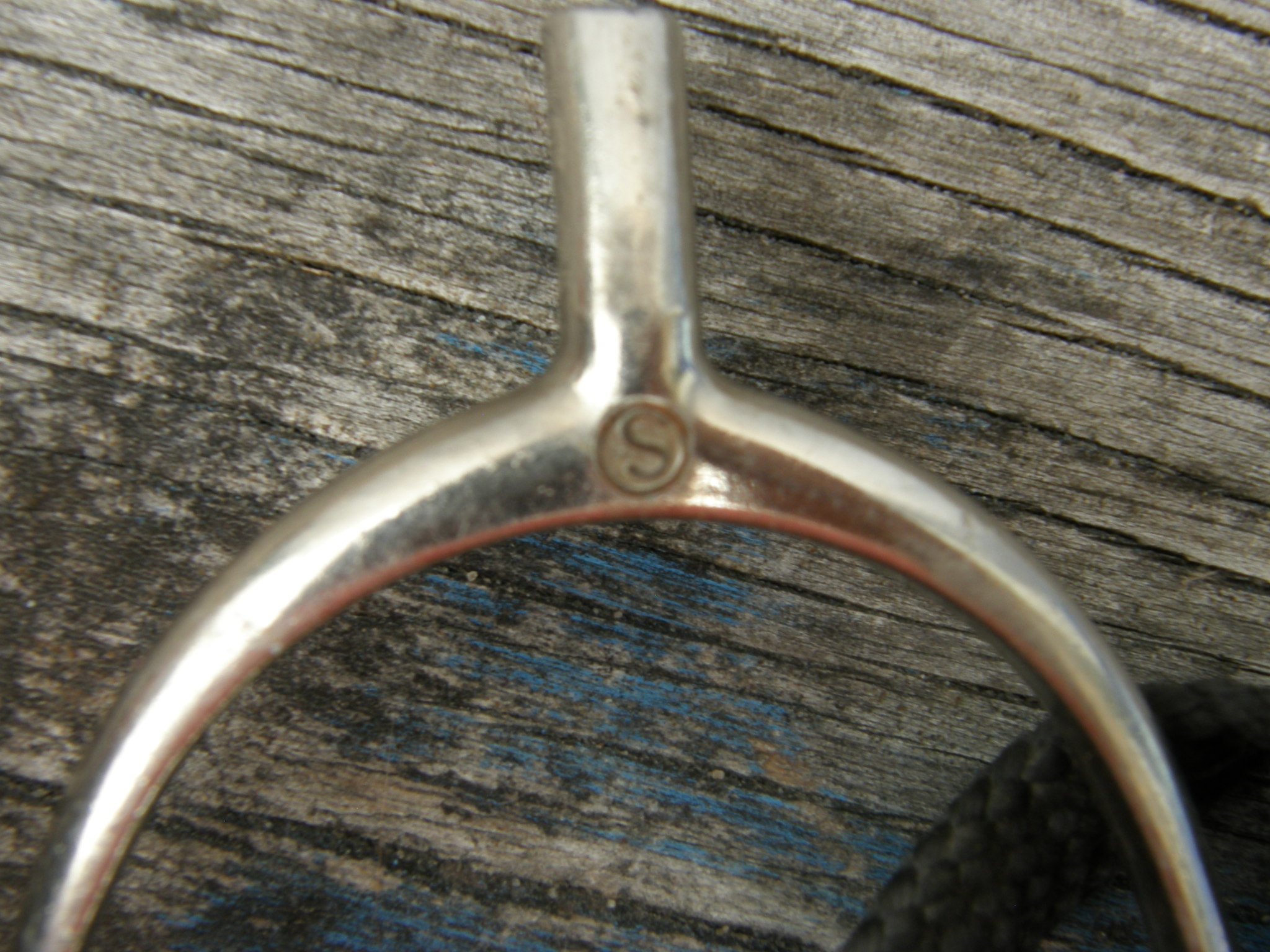 This spur has a 1 1/8'' neck with smooth blunt knob end, squared spur strap slots. 3” wide opening, approx 4” deep, 1/2” flat band. Stamped HS. Does not react to magnet so should be stainless steel. Single spur only.