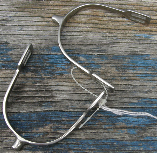 These Prince of Wales ladies spurs have a 3/4'' neck, blunt end, 5/16" band & rounded spur strap slots. Approx 3 1/4" opening. Stainless steel coated as it reacts mildly to magnet. Brand unknown.