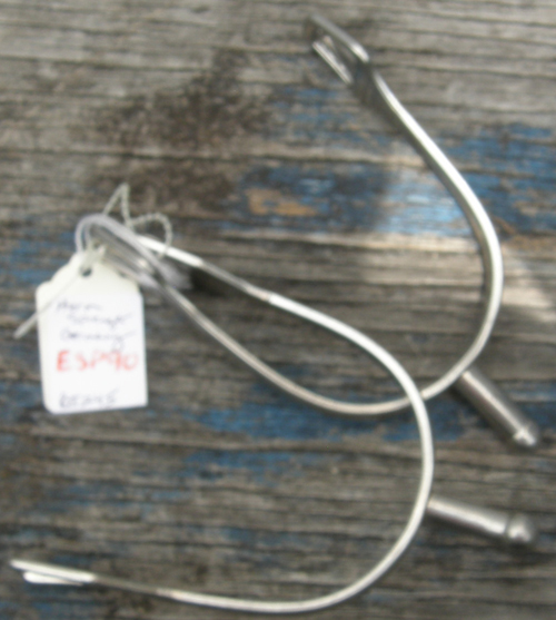 These spurs are constructed of stainless steel with 3/4'' long neck with smooth blunt end, squared spur strap slots, 2 3/4” wide opening, approx 3 3/4” deep, & 5/16” rounded band. Stamped S, so don't know if that is for brand or for Stainless. Excellent used condition.