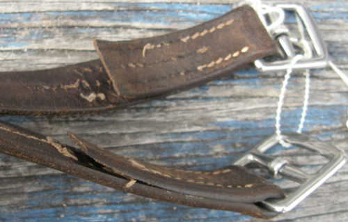 Good quality stirrup leather with stainless steel coated buckles that react mildly to magnet. 1" wide x 60" long with 1 leather stretched slightly longer. A blue rivet or stud on end of each leather. Supple leather that just flows in your hands. Lots of extra holes punched & wear marks at several holes but no cracking or anything unsafe. Several stitches at buckle ends have pulled out & they need restitching to be completely safe. Selling AS IS. Brand unknown but has a oval type mark near end so possibly Crosby.