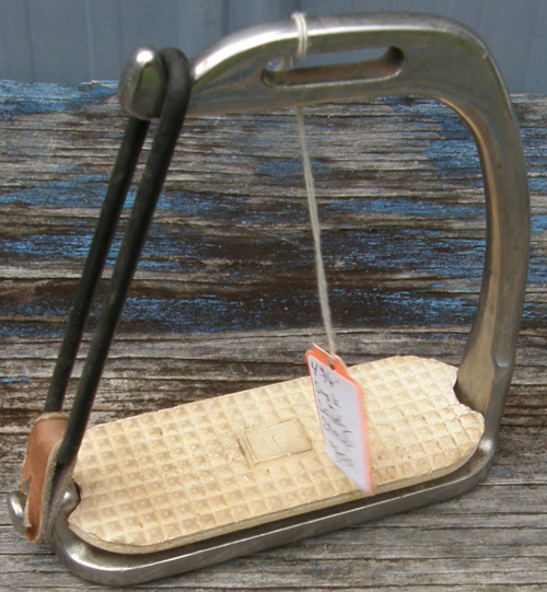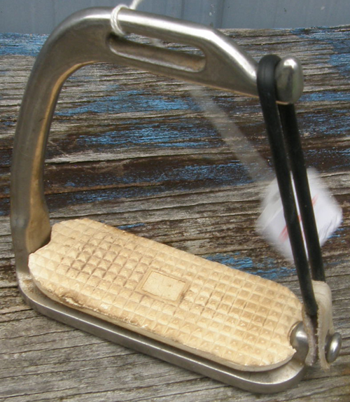 Peacock or safety stirrup. This is a single stirrup iron with white pad, choice of 4 1/2” or 4 3/4” tread, rubber bands ok, but should be replaced, good used condition. Great replacement incase you lost one.