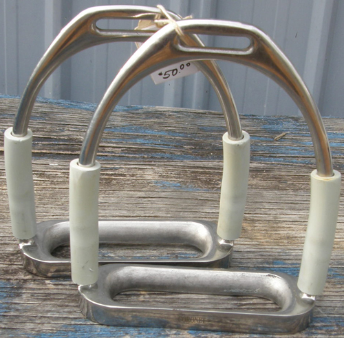 English stirrups with 4 1/2" tread. Patent-pending stirrup iron design for beginners, professionals & every level in between. The irons are constructed with flexion points under a soft white rubber, giving the irons the freedom to have forward & backward movement. Not only does this movement allow your foot to release in the event of a fall, but the flexion provides shock absorption for the rider's ankles, knees & back, resulting in a "softer" ride. Does not come with rubber pads. Stamped Coronet. These look & feel like stainless but react to magnet so is stainless steel coated. Look like new but minor cracking to rubber at joints(see photo).