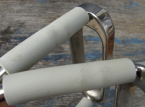 Stainless steel coated(?) stirrups with 4 1/4” tread. Comes with used black rubber pads. Some minor tiny spots or bubbles in stainless steel overlay. Does not react to magnet. Stamped “S“ at top of stirrup neck.