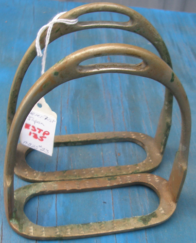 Vintage brass or nickel English stirrups that have 4 1/2" tread, no rubber pads. One stirrup tread is slightly bent downward(see photo). Great for decorating or adding to a vintage saddle. Has a brassy/greenish look to them, no rust. Stamped on bottom Never Rust Japan.