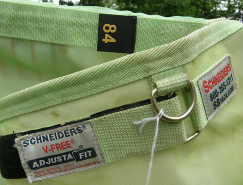 The fabric of the Kensington Fly Sheet provides durable protection against biting insects & protects against UV rays. Ultra-breathable, the sheet keeps your horse comfortable in the summer heat. It features a nylon lined chest, padded nylon pad at wither, detachable elastic leg straps, single adjustable belly strap (fastens with snap & D-rings), & D rings for hood attachment or easy hanging. Tagged size 84. Clean, some corrosion on hardware & light dirt stains on straps, but horse must have caught the left side of the chest piece & riped the edging off. Was repaired by moving the edging trim to solid fabric for better stitching, but this created 1 side to be more shaped/scalloped than the other(see photo) & a dart to remove excess bulging of fabric. A small finger sized hole remains near the repair. Other than the repairs, the sheet looks like new, as owner says it ripped shortly after being put on the horse. Hardware corrosion is more from sitting than wear.
