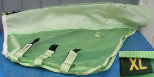 Closed front extra fine "window screen" 350D nylon mesh sheet with belly band, rear leg straps, fitted/tapered rear, XL tail cover, reflective stripes for safety, adjustable elastic leg straps, & removable neck cover. This sheet works very well for both fly, gnat, mosquito & UV protection, with good airflow & antibaterial nylon lining on chest. shoulders & tail flap. Adjusta-Fit system allows you to customize fit in the shoulders/wither area while the V-free provides wither relief. Excellent used condition with no holes & only some dirt staining to top of back(horse liked to roll alot). Comes with detachable matching mesh neck cover in XL that looks like it was maybe used once. Has matching fly boots & fly mask available, ask.