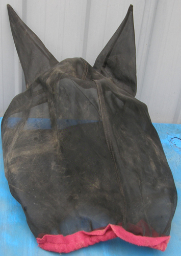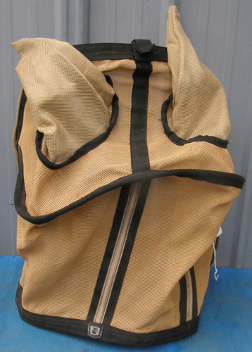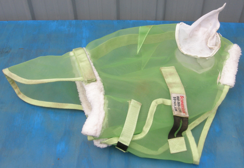 UV coated mesh with soft mesh ears, stays on either side of face to help retain shape & stay off the eyes, velcro lining muzzle so nose piece could be added(not included), hook & loop closure loop at crown to attach to halter, & 1 wide double closure hook & loop closure at throat. Tagged XL Horse it measures 20" top to bottom. Clean, touch tape closure a bit worn, a few rub marks on soft mesh ears but no holes.