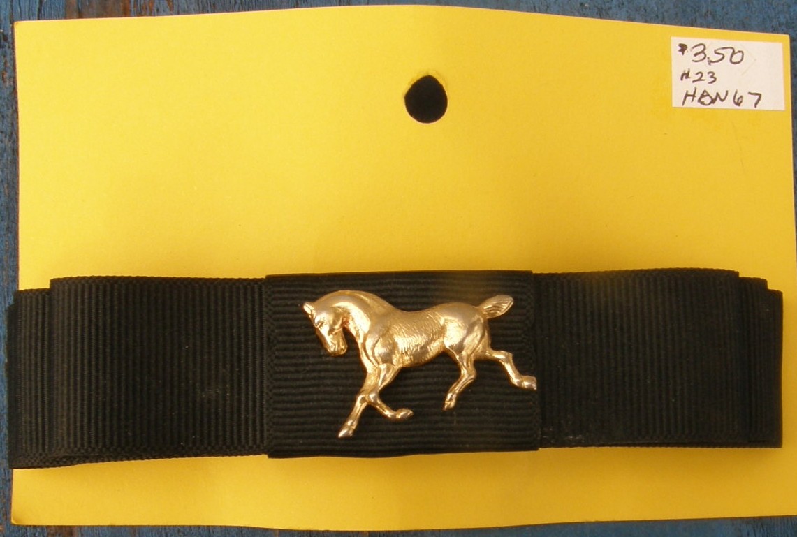 Clip on hair bow/hair barrette made out of grosgrain ribbon with gold tone running horse. Was originally with a net underneath for containing your hair, but owner cut off net. Great for horse lovers. Snap clip type barrette. Bow measures approx 4 3/4" wide.