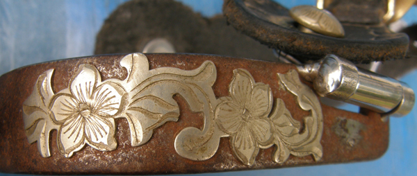 Engraved band western spurs with braided/weave pattern, flat brass blunt rowels, 1 1/2” engraved neck, 3/4” wide band, 3" opening, approx 3" deep, & brass buttons. Comes with wide lightly tooled light oil western spur straps. Blunt rowels have some corrosion on them & end of 1 spur strap looks like it was chewedbut does not interefere with use.