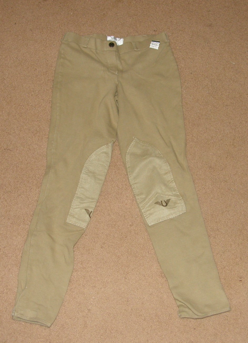 Pull on style breeches with elastic & drawstring waist, fake front zipper placket, same fabric knee patches, & elastic grippers inside ankles with buttons sewn in. Could be used with a paddock/jodhpur boot as grippers will help keep pant legs down. Straps not included. 95% cotton/5% Lycra. Tagged size XL(childs) it measures unstretched 29” at waist & has a 20” inseam. Has lots of small rust like spots scattered mainly on lower legs & butt, & elastic grippers inside ankles have deteriorated. Hard to find small size for the chunky rider. Great for lessons, schooling, etc.