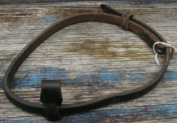 Narrow strap or flash attachment replacement strap for flash noseband cavesons. It is placed in front of the bit & aids in keeping horses mouth closed. 1/2” leather with rubbed edges & darkened edges, & stainless steel buckle. Largest adjustment measures approx 24”, smallest approx 19 1/2" with 8 factory punched holes. Strap only, no hinge or connector strap. Leather in good condition & still flexible.