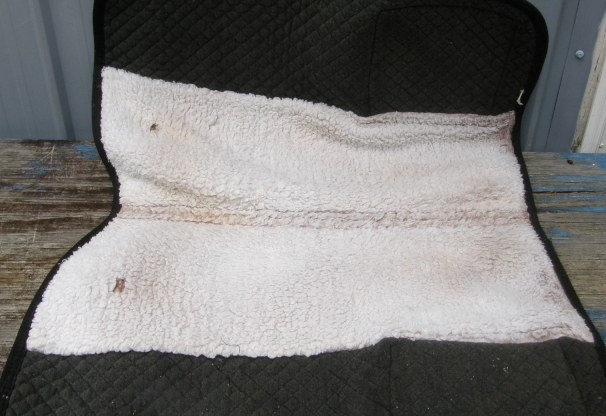 Fleece event style English saddle pad with quilted cotton lining, Velcro billet keepers & keepers at bottom of flap for girth. Approx 21” long at spine, 18” drop from spine to bottom of flap. Some stains on underside.