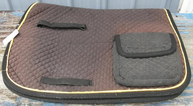 Half fleece lined quilted English saddle pad with pockets or bags in rear for carrying beverages, food, or accessories. 5/8" quilted squares, has velcro billet straps, nylon girth guide & 8" x 8" x 1 1/2" pockets, 1 on each side with velcro closures/no buckles to fiddle with. Pad measures approx 24\rdblquote at spine with a 19\rdblquote drop. Great for trail riding with an English or Australian Saddle. Clean, minor hair in fleece, some fuzzies to top side from washing due to fleece lining, & some small frayed areas to gold piping.