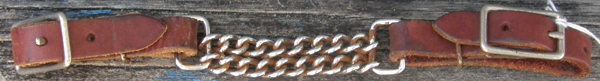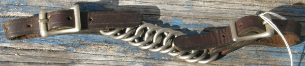 5/8'' leather curb strap has a 3 1/2'' single flat link chain. Nickel plated hardware. This was a larger curb chain that was cut down for a pony so even though each side has 3 holes for adjustment, it really only works as set now at approx 8" total length. Leather is a little stiff but not dry rotted. Brand unknown.
