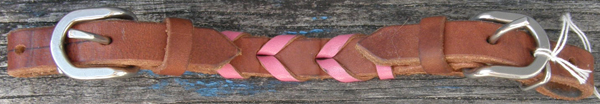 5/8" Argentina cow leather curb strap with pink leather lacing, 2 metal keepers & 4 factory punched holes on each side. Use on horse that doesn't need a curb chain. Measures as set on last/largest hole approx 10" long. Lightly used, looks like new except for dark mark from contact with bit.