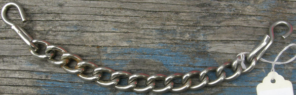Flat link chain replacement center piece for western curb chain. Measures 4 3/8" long x approx 3/4" wide with squared ends for either nylon or leather ends(see WCC12). Also can be used for hackamore bits, pony bits or even English pony bits so there is not any excess chain hanging. Excellent used condition with only minor rust.