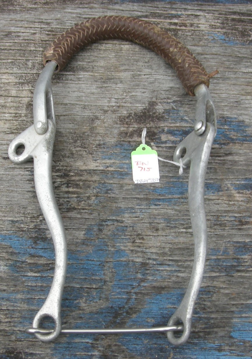 Hackamore bit with braided leather noseband & 8 1/2" cast aluminum shanks. Comes with stainless steel connector bar. Aluminum has some small areas of discoloration/minor pitting. Age unknown, possibly vintage. Brand unknown.