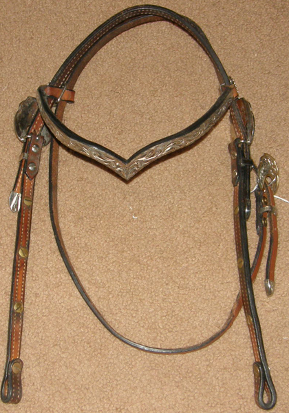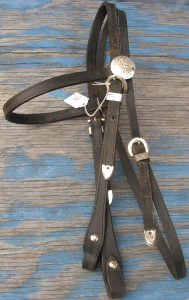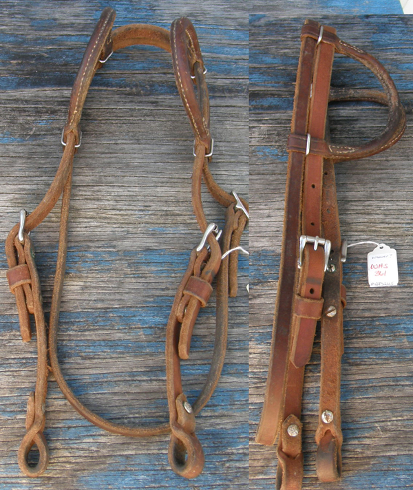 Same as above, has halter, throatlatch, adjustable chin, snap cheeks, but no browband. Cleaned, has minor rust on some hardware. Buckles/snaps all work.