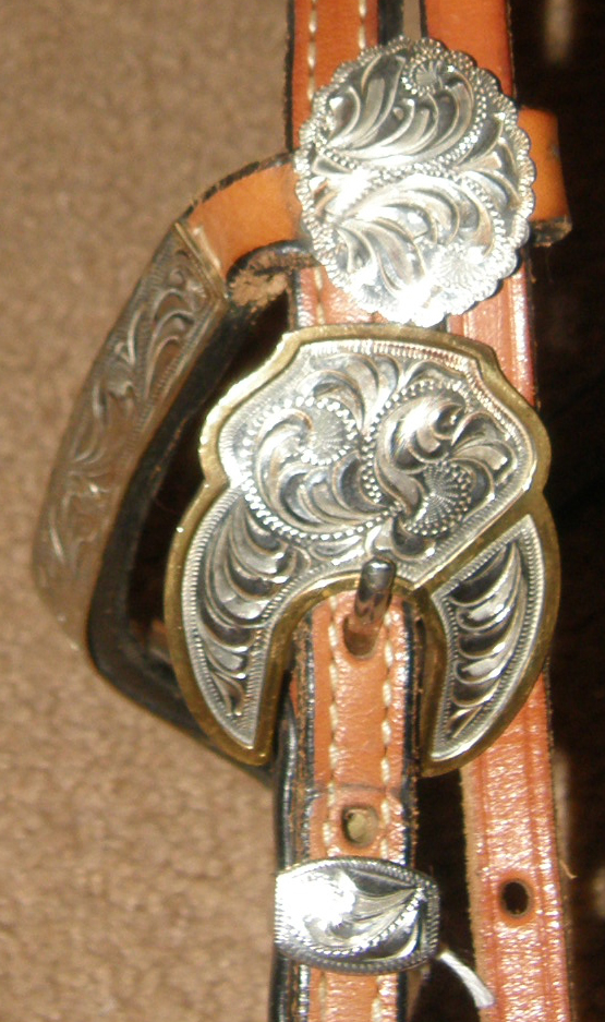 Braided natural rawhide with dark/black horsehair tassel decorates this sliding one ear style western headstall with 5/8" wide doubled & stitched leather, dark contrast stitching, rubbed & darkened edges, cheeks that adjust on one side with a large fancy buckle, keeper & tip, & fancy conchos at bit ends. No throatlatch style for a nice clean look on your horses head. This was an award headstall from PCHA(PA Cutting Horse Assoc) in 2003 & has never been on a horse. Large silver buckle has gold & copper accents, keeper has 2003 in gold, & keeper has a swirl in copper. Buckle is removable with Chicago screws. Measures approx 34 1/2" at smallest & 38” at largest adjustment.