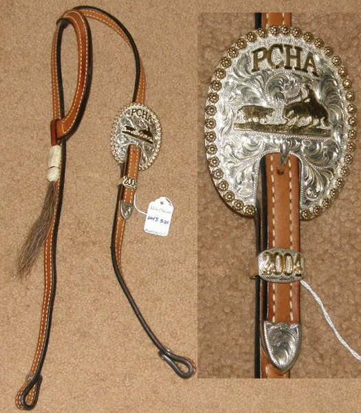 Braided natural rawhide with dark grey/brown horsehair tassel decorates this sliding one ear style western headstall with 5/8" wide doubled & stitched leather, white contrast stitching, rubbed & darkened edges, cheeks that adjust on one side with a large fancy buckle, keeper & tip, & fancy conchos at bit ends. No throatlatch style for a nice clean look on your horses head. This was an award headstall from PCHA(PA Cutting Horse Assoc) in 2004 & has never been on a horse. Large silver buckle has gold accents, keeper has 2004 in gold, & keeper is engraved with a swirl pattern. Buckle is removable with Chicago screws. Measures approx 36" at smallest & 40” at largest adjustment. One ear & cheek on same side rubbed next to an oiled bridle so light slightly darker spots in a few places.