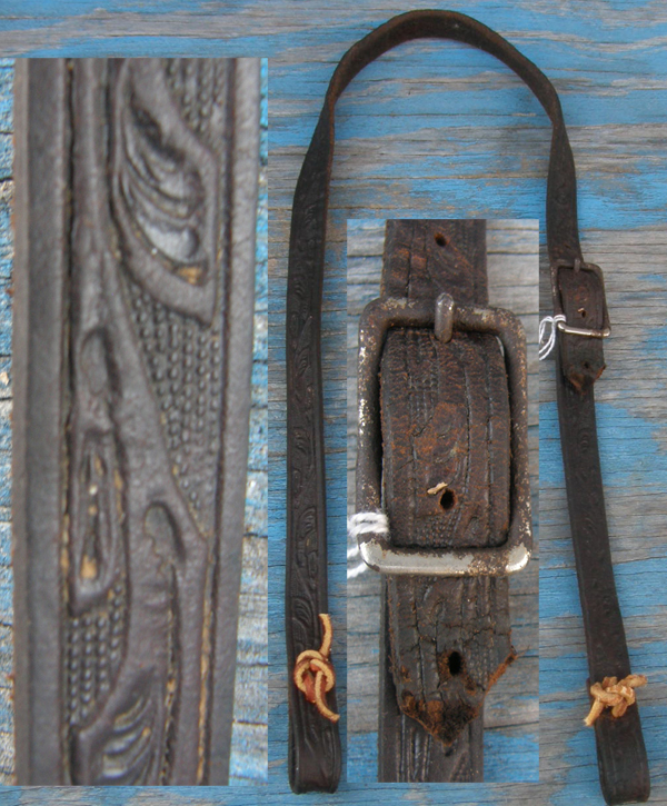 Single ply 3/4" wide tooled brown leather simple western headstall with rubbed & darkened edges, crown adjusts on 1 side, & has leather string ties at bit ends. No throatlatch or browband. Measures approx 36” at largest adjustment. Possibly vintage, it was cut down from a bigger size. Leather is supple & buckle is rusty but works fine. Still very usable, but would look great on a rocking horse or similar craft project. Brand unknown.