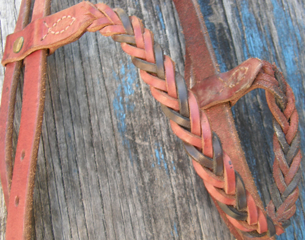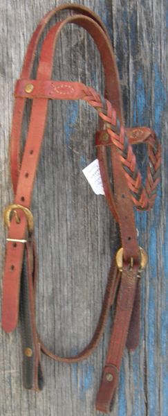 Western headstall in reddish latigo leather features black overlay on cheeks that adjust on both sides, brass buckles & screws, & has a braided 5 plait black & reddish leather browband. Headstall measures 30 1/2" at smallest & 42" at largest adjustment with 6 factory punched holes on each side & Chicago screws at bit ends. Excellent hardly used condition.