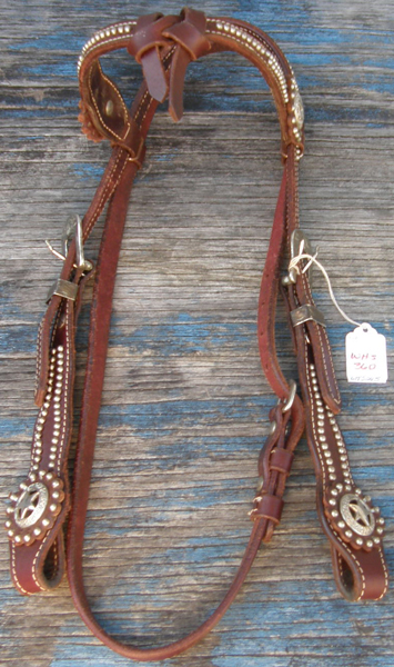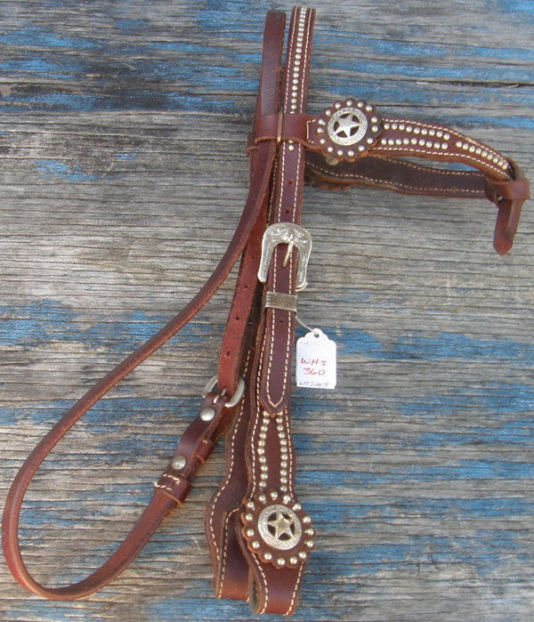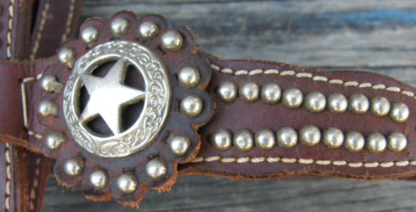 Knotted browband style western headstall with silver dots or studs on crown piece, shaped cheeks & browband. Adjusts on both sides & has engraved "silver" buckles & keepers. It measures approx 31 1/2" at smallest & 41" at largest adjustment. Entire bridle except for throatlatch is doubled & stitched russet leather with rubbed & darkened edges & white contrast stitching. Has 1 1/8” diameter Texas Star conchos on both sides of browband & cheeks at bit ends. Brand unknown, maybe Tahoe Tack, Shiloh Tack, Showman,etc. Excellent lightly used condition.
