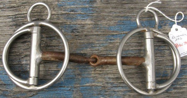 4 1/2” copper twisted wire jointed snaffle mouthpiece with 3 5/8” high flat stainless steel rings. Mouthpiece measured inside bulb to inside bulb, or measures 5 1/2" inside ring to inside ring. Rings are stainless steel coated as they react lightly to a magnet. Because of rings, this is a fairly heavy bit, although mouthpiece is light. Great western training snaffle that lifts, while still giving weight to encourage horse to lower head. Can be used English or Western. Brand unknown. Several chew marks on mouthpiece that we filed smooth.