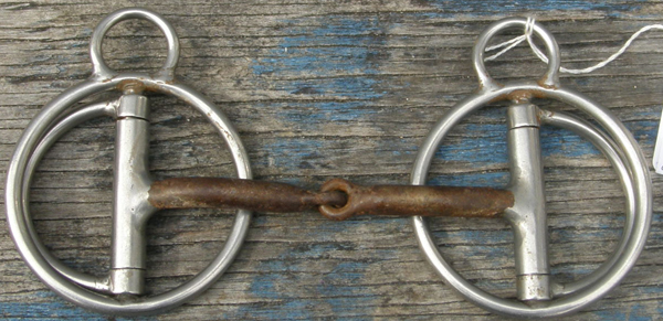 4" sweet iron jointed snaffle mouthpiece with copper inlays, stainless steel overlay at joints & has 2 3/4" untreated steel or antique brown rings with "silver" dots. Called an Offset D, rings are not really D shaped. Brand unknown but should be a Kelly bit. Untreated steel is meant to rust as taste of rust helps promote a moist & softer mouth. Minor rust as intended. Nice show bit in hard to find size.