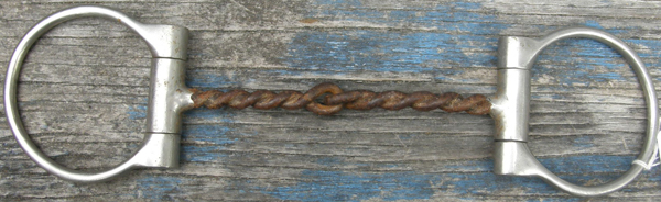 5” twisted wire 3/8" jointed snaffle mouthpiece with 2 7/8” diameter rings. Measures 5" inside bulb to inside bulb or 5 1/2" inside ring to inside ring. Slightly curved comfort mouthpiece. Stamped 701 on 1 ring. The twisted snaffle helps not only to educate a young horse, but also to help keep an older horse light in the mouth. The loose ring snaffle applies pressure to the bars and corners of mouth for direct pressure which makes it ideal to ride 2 handed. The mouthpiece is made of sweet iron which will naturally rust into a light patina. The rust creates a sweet taste for the horse and makes the bit more acceptable and increases salivation for a supple mouth. Can be used English or Western. Excellent hardly used condition.