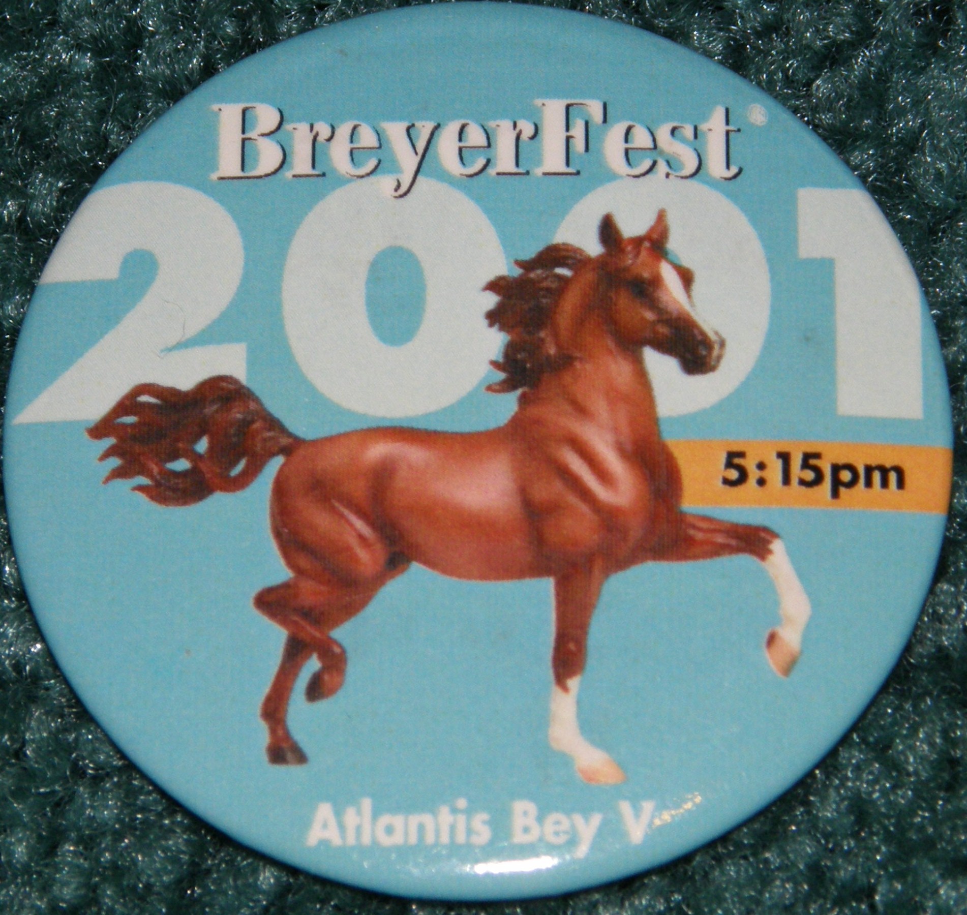 Button of horse model #702901 Atlantis Bey V, famous real Arabian horse(Huckleberry Bey mold)for Breyerfest. Pin back button was made by Breyer in 2001 for Breyerfest attendees & SR model recipients only(meaning you had to go to Breyerfest in Lexington, KY or have someone pick up a model for you there).