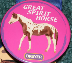 Button of Pinto horse model #1199 Great Spirit Horse(San Domingo mold). Pin back button was made by Breyer for a limited time during 2003 only, this is sure to be a great collector piece!