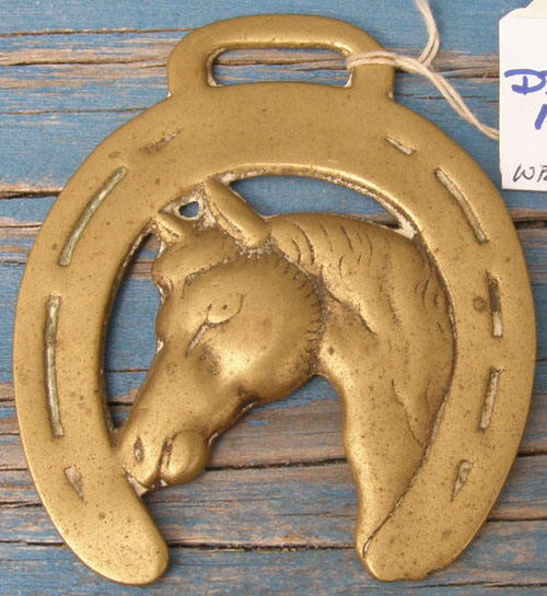 Vintage horse harness brass or harness decoration of a horse head inside an upside down horse shoe measuring 3 1/4" wide x 4" tall with slot at top for hanging. Age nor maker is known. Use as a decoration or hang on the front of harness.