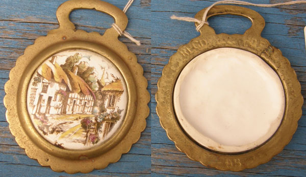 Vintage horse harness brass or harness decoration with a ceramic or porcelain with an old country street/hamlet scene on it inside a lightly scalloped rim measuring 3 3/8" wide x 4" tall with slot at top for hanging. Age nor maker is known, but is stamped England, what looks like REGD & AB on back. Use as a decoration or hang on the front of harness.