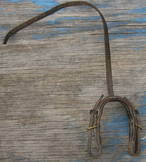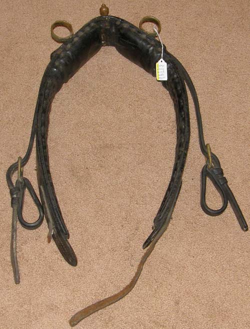 Driving bridle overcheck front strap for horse driving harness. Measures 19 1/2" long to last hole with 5 hole adjustment at bit ends & 5 hole adjustment plus 2 half holes added at crown. Brass buckles. Brand unknown. Was used on a standardbred harness but will work with most driving bridles. Leather is supple with some wear at bit end, still very usable.