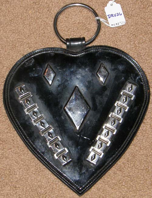 Custom made draft horse harness line drop made with black patent leather top, smooth leather backing, 3” diameter ring at top & decorated with 2 small & 1 large chrome/nickel diamonds & some fancy chrome trim. Ended up being to heavy for the lines, so use as a decoration, or hang on the front of a single harness. Measures a hair over 9” wide x 10” high. New, only tried on lines once. Only 1 available.