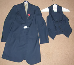 Saddleseat suit consisting of day coat with silk rose buttoneer & matching vest. Polyester, dry clean only. Coat has 2 button front & 3 on each sleeve, fake breast & front pockets, & is darted for a fitted look. Tagged size 10, it flat measures approx 17" across front armpit to armpit, 33 1/2" mid shoulder to bottom hem & has a 16" sleeve inseam. Brand unknown.