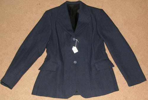 100% wool tailored English jacket for showing, dry clean only. It is fully lined, & has 3 front buttons, 3 buttons on sleeves, double back vent, 2 front pockets & 1 small pocket inside lining with spare buttons, & is darted for a fitted look. Tagged size 20R Regular(Ladies), it flat measures approx 20” armpit to armpit across front, 26” from shoulder to bottom hem, 14” sleeve inseam. Use for showing hunt seat or lower level Dressage. Few faint light spots on lining, may need to be cleaned.