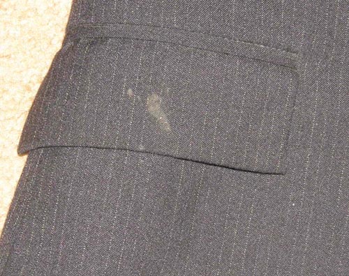 60% polyester/40% rayon English jacket with 3 front buttons, 3 buttons on sleeves, double back vent & 2 front pockets. Flat measures approx 16 1”/2 armpit to armpit across the front, 25” shoulder to bottom hem, & 16” sleeve inseam. Few light spots on front from ring surface splash or horse sneeze(?), will need to be cleaned. Dry clean only.