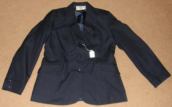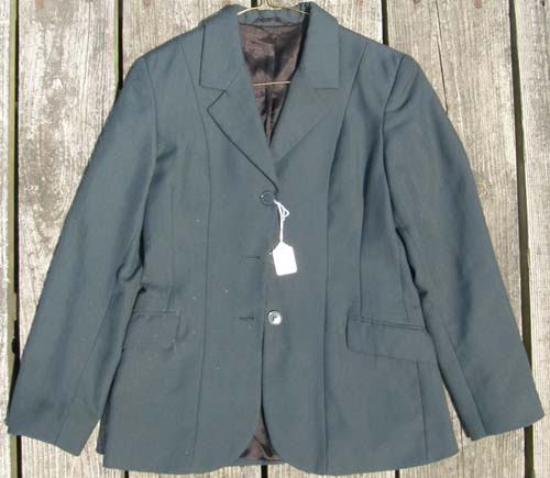 Easy care breathable fully lined English show jacket with "noiseless" twill fabric, 4 way stretch with 3 button front, 2 stitched shut front pockets, 3 buttons on sleeves, darted & fitted, & double vented back. Machine washable 91% poly/9% elastane. Tagged Childs 12, it flat measures approx 15" armpit to armpit across the front, 23" mid shoulder to bottom hem, & 13" sleeve inseam.