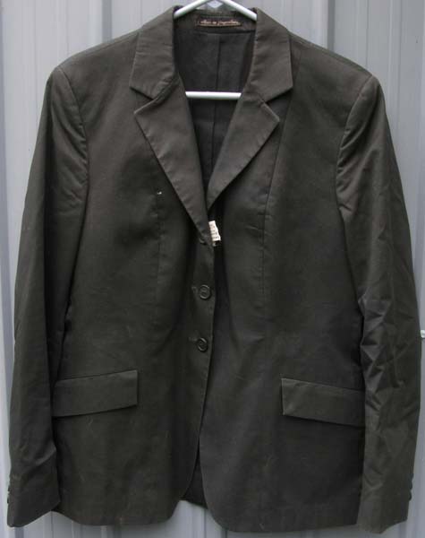 75% cotton/25% polyester English jacket with double back vent & 2 front pockets. Use for showing or lower level Dressage. Tagged size 18R it measures approx 20 1/2” armpit to armpit across the front, 26” mid-shoulder to bottom hem, & 16 1/2” sleeve inseam. Excellent used condition but does have light fading(not super black anymore).