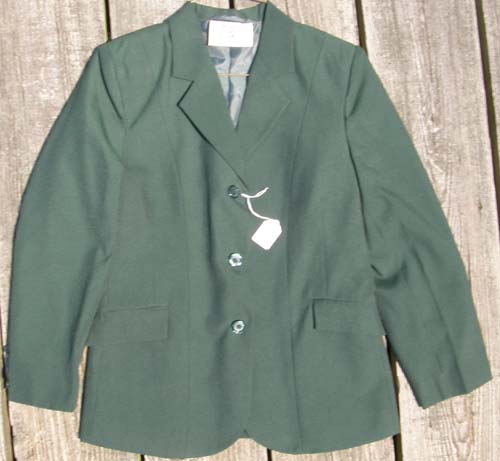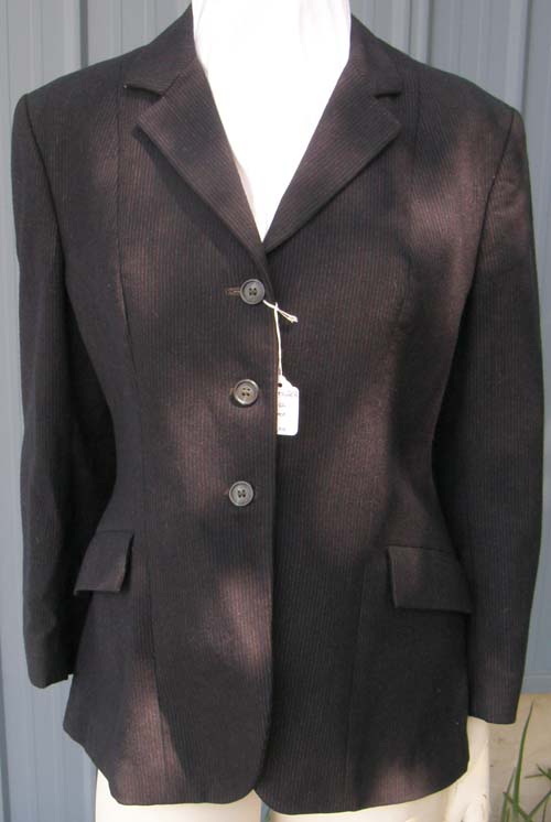 60% polyester/40% rayon tailored English jacket for showing, dry clean only. It is fully lined, & has 3 buttons on the front & 3 on each sleeve, 2 front pockets still stitched shut, double vented back, & is darted for a fitted look. Tagged size 8R Regular(Ladies), it flat measures approx 17 1/2” armpit to armpit across front, 24 1/2” from mid-shoulder to bottom hem, 15 1/2” sleeve inseam. This impeccably tailored equestrian jacket with give you the blue ribbon appearance in any ring.