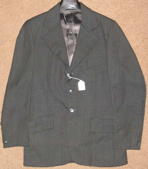Polyester/wool blend(?) tailored English jacket for showing, dry clean only. It is fully lined, & has 3 buttons on the front & 1 on each sleeve, 2 front pockets, 1 breast pocket, double vented back, & is darted for a fitted look. Tagged size 4(Mens), it flat measures approx 18” armpit to armpit across front, 27” from mid-shoulder to bottom hem, & has a 16” sleeve inseam. Men's show clothes are so hard to find, and this one's in great shape. A few small pulls to inside lining from show number pins.