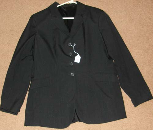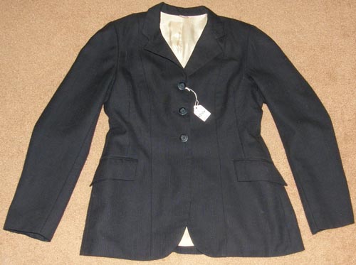 100% polyester English jacket for showing, dry clean only. It is fully lined, & has 3 buttons on the front, 2 front pockets, & double vented back. Tagged size 16(Childs), it flat measures approx 16” armpit to armpit across the front, 22” mid-shoulder to bottom hem, & 17” sleeve inseam.