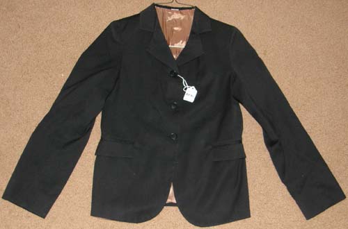 100% polyester English jacket for showing, dry clean only. It is fully lined, & has 3 buttons on the front, 2 front pockets, & double vented back. Tagged size 12(Childs), it flat measures approx 15” armpit to armpit across the front, 20” mid-shoulder to bottom hem, & 15 1/2” sleeve inseam.