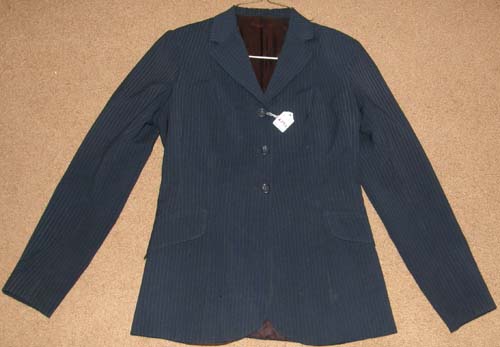 100% pure virgin wool English show jacket with 3 button front, 2 front pockets, 3 buttons on sleeves, darted & fitted, & double vented back. Flat measures approx 17 1/2" armpit to armpit across the front, 25" mid shoulder to bottom hem, 16 1/2" sleeve inseam. Dark navy blue with faint pinstripe. Dry clean only. Has just been cleaned.