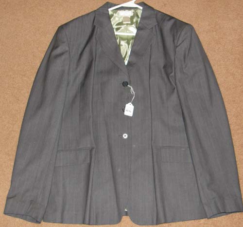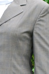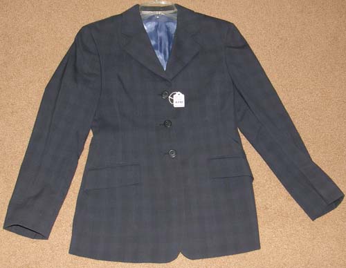 100% wool(see below) English show jacket with 3 button front, 2 front pockets, 4 buttons on sleeves, darted & fitted, & double vented back. Flat measures approx 17" armpit to armpit across the front, 25 3/4" mid shoulder to bottom hem, 16 1/4" sleeve inseam. Dark grey or charcoal with faint same color plaid line pattern. Tagged 100% wool but it doesn't feel like wool to us, feels more like a poly blend, so may be mislabeled. Dry clean. Minor dirt on back of sleeves/elbows but should come off.